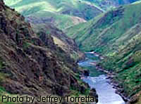 Hell's Canyon is a mile deep framed by 10,000 foot peaks of theWallowas Mountains. The Snake River wanders along the bottom of the gorge. Much of the gorge is inaccessable.